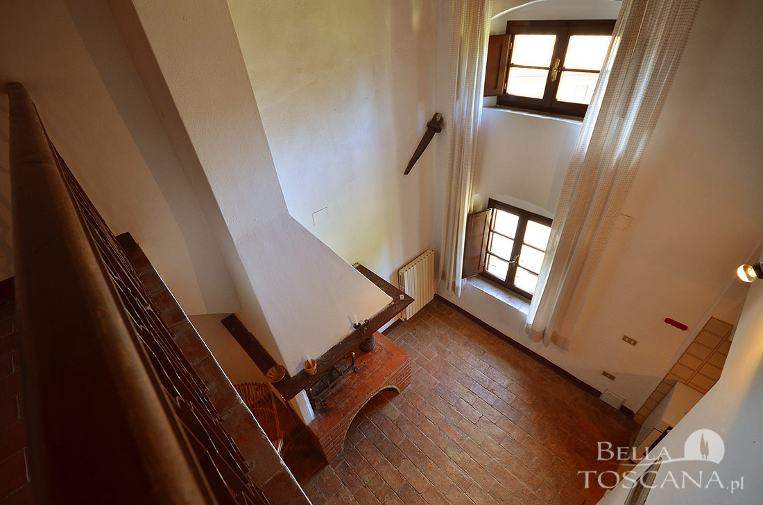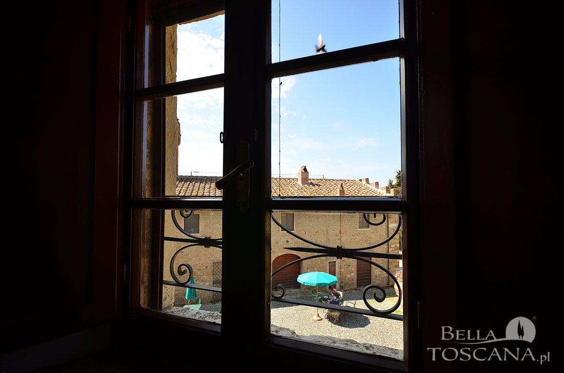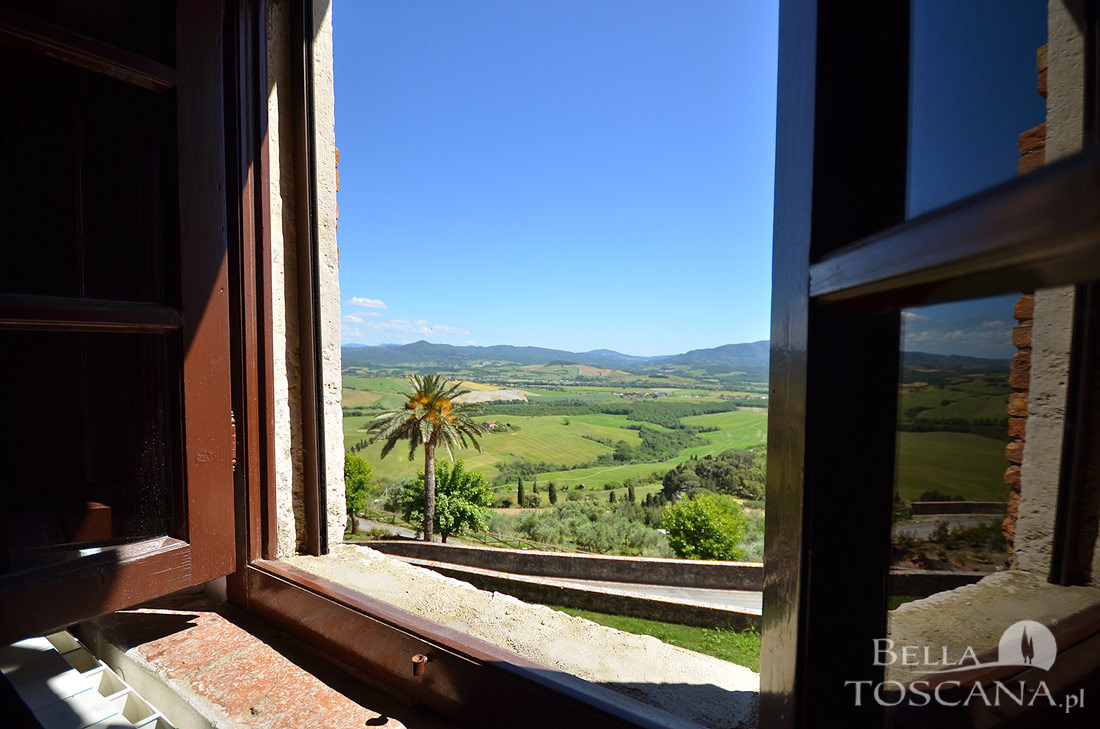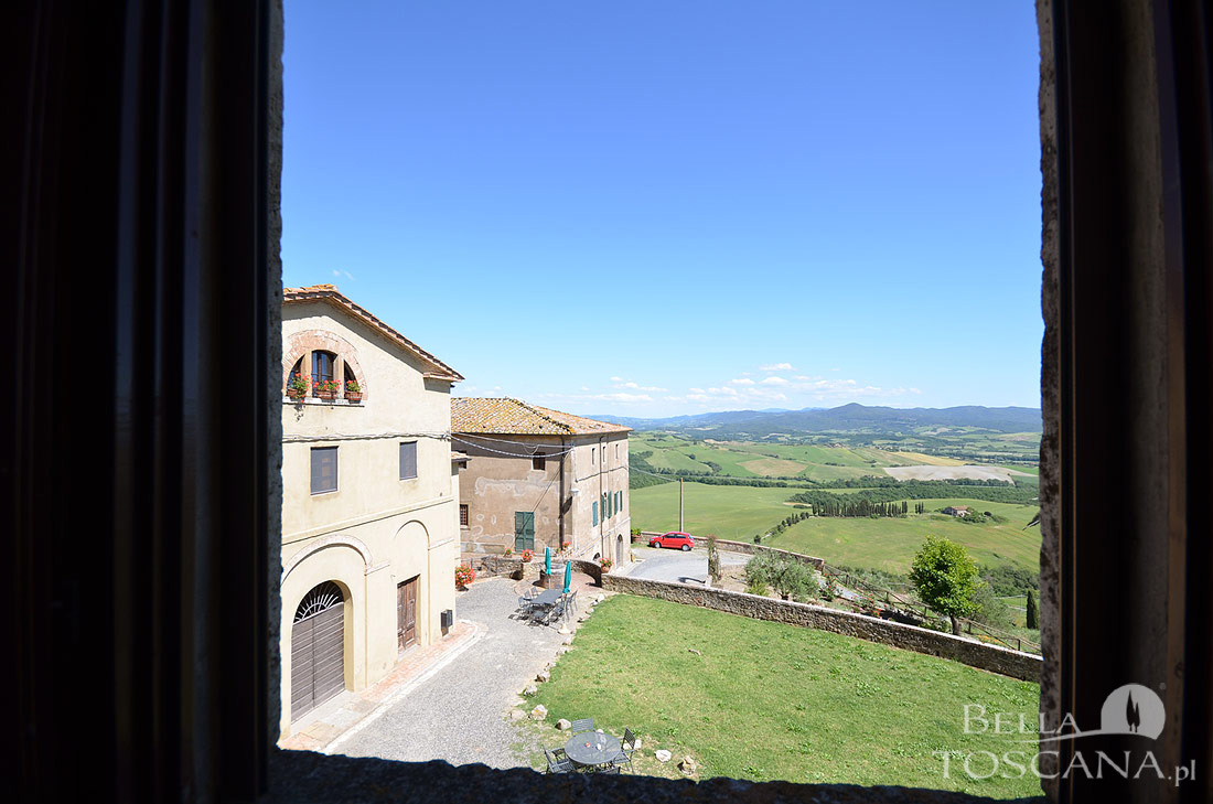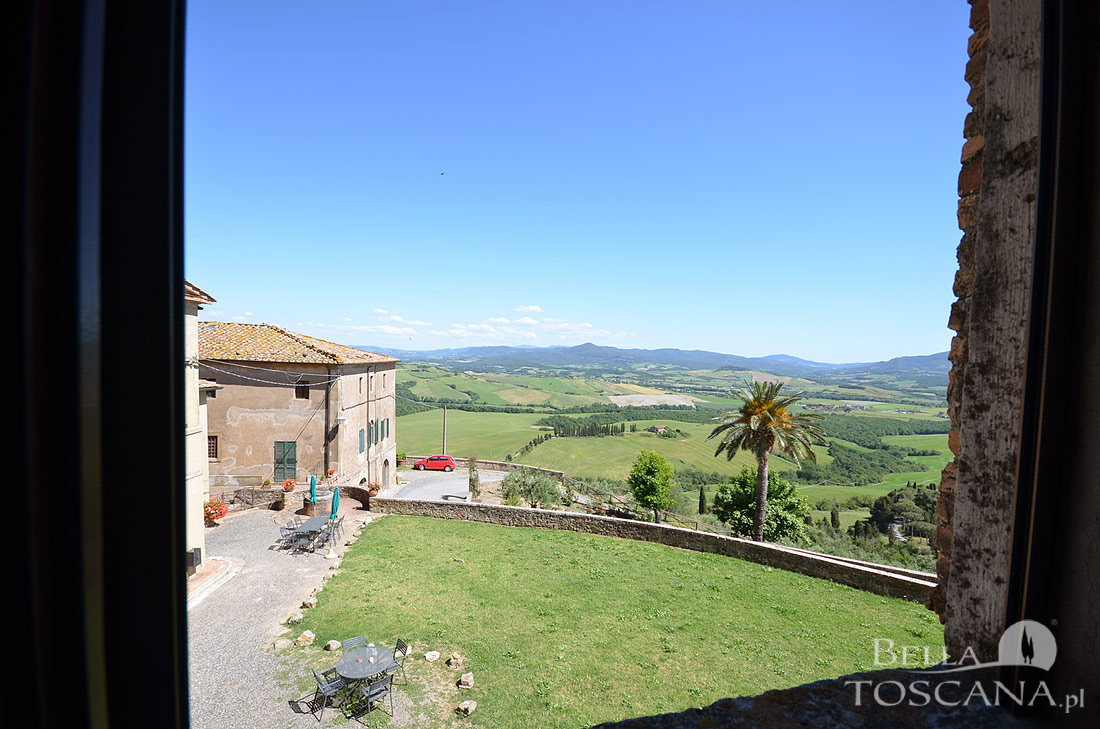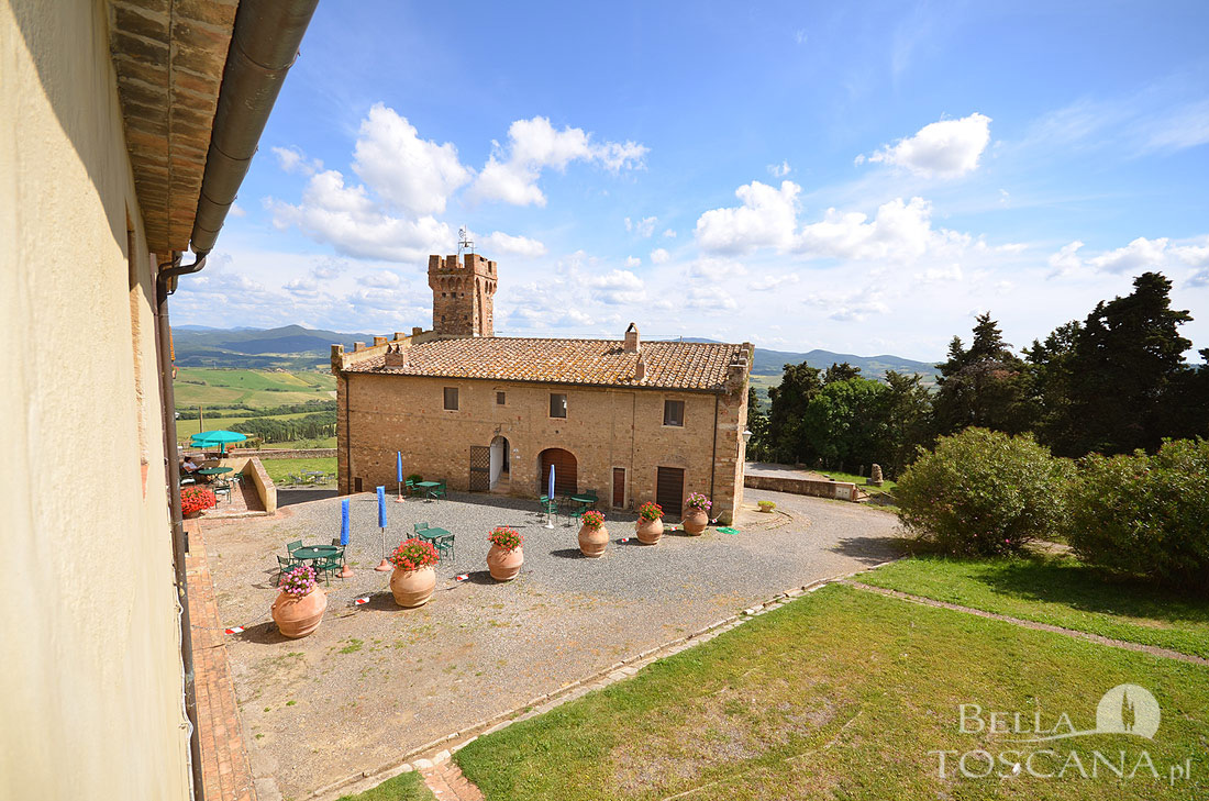 i kościołem. Ze wzgórza roztacza się wyjątkowa panorama na dolinę rzeki pośród pięknych wzgórz Toskanii. Droga dojazdowa prowadzi przez zachwycające krajobrazy, winnic, pól uprawnych i gai oliwnych. Przy dobrej pogodzie można stąd dojrzeć Morze Tyrreńskie (20 km).